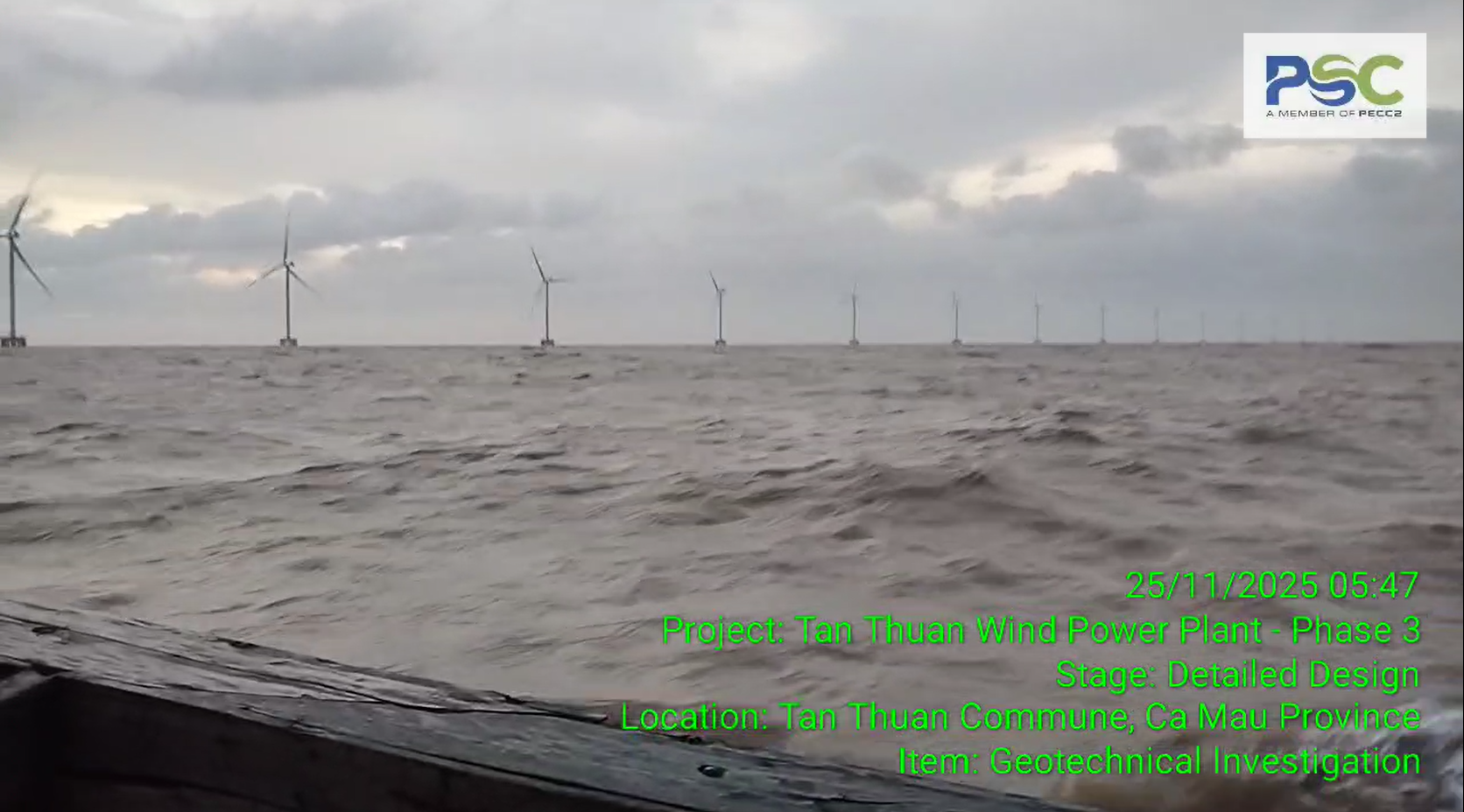 Với Dự án Nhà máy điện gió Tân Thuận giai đoạn 3, đội ngũ khảo sát của PSC đã nỗ lực, kiên cường vượt sóng, tự hào vượt qua những thử thách khắc nghiệt của thiên nhiên. Đến đầu tháng 12, với hơn 300 giờ lao động an toàn trong điều kiện thời tiết rất khó khăn trên biển, PSC đã hoàn thành khảo sát Nhà máy điện gió Tân thuận giai đoạn 3 và được Chủ đầu tư đánh giá cao về tiến độ, chất lượng cho Dự án.